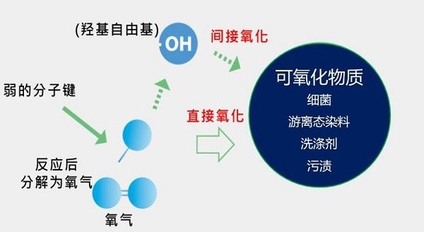 与普通化学氧化相比,蓝氧氧化反应中产生的中间产物会继续和自由基发生反应,直至完全矿化,彻底反应。因此它能作用于杀菌、消毒、去除特殊污渍、降解水中游离色素等有机污染物,并且无二次污染。