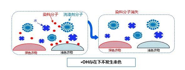 另外能够降解水中游离色素的能力让蓝氧能够有效防止衣物之间的串色。当洗护的衣物掉色后,染料将会分散在水中,沾染到其他衣物,而蓝氧的加入则能让染料在水中分解,切断染料的迁移途径,使清洗的衣物保持清洁的同时依旧亮白如初。