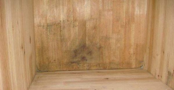 并且次卫上面也是邻居的卫生间,管道外部经常有冷凝水掉到天花板上,再滴到衣柜上,所以板材的湿度很大,也就出现发霉的迹象。