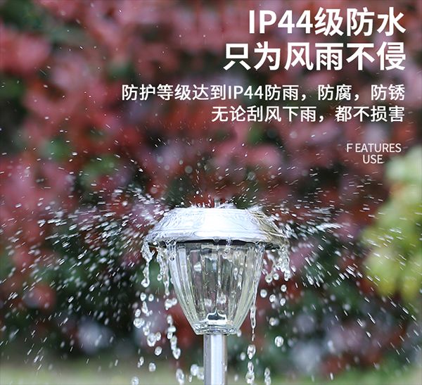 3、阴雨天智能控制系统,使太阳能草坪景观灯在连续阴雨天也能正常亮灯。在连续阴雨天气,点点太阳能草坪景观灯会自动采用降低亮度、缩短亮灯时长等策略,延长电量的使用时间。