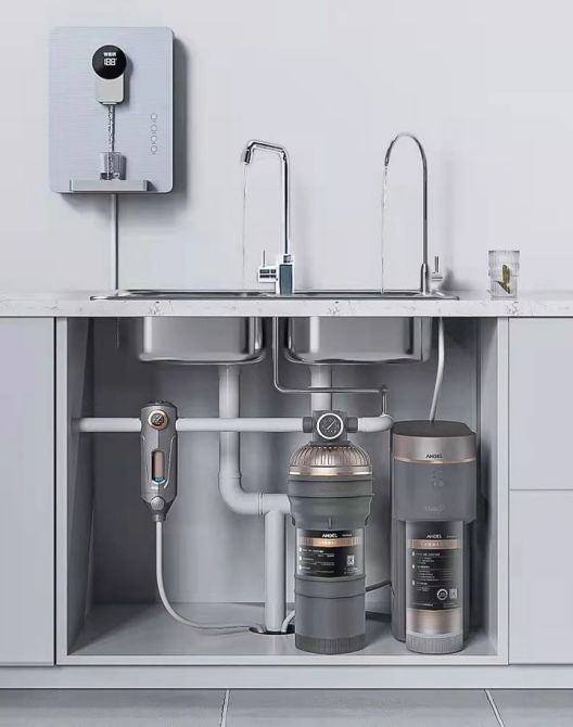 安吉尔全屋净水系统主要由前置过滤器、中央净水机、软水机、反渗透净水器、即热饮水机组成。简单讲,就是先由前置过滤器进行第一道粗过滤,滤除自来水中的铁锈、大颗粒泥沙,一般安装在入户水表后,可有效解决水龙头堵塞、涉水家电耗电高、故障频发等问题,延长涉水家电的使用寿命。安吉尔前置过滤器安装非常便捷,如果消费者在装修前就已经规划要装全屋净水并预留好尺寸,前置过滤器可以按照规划安装;如果未提前预留位置,前置过滤器也可灵活串联安装在入户水管,或者水表后端的进水总阀处甚至厨下。