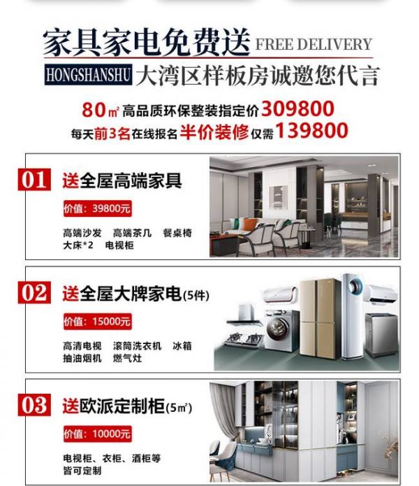80平一站式全包整装,整装原价309800,现场只要139800,包全部设计、全部人工、全部材料、全屋水电和整体厨房!还要送全屋家具、家电、灯具和窗帘!