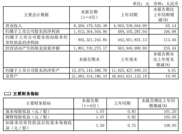 8月26日晚间,欧派家居(603833)发布2021年半年度报告。报告显示:2021年上半年,欧派家居实现营业总收入82.00亿元,比上年同期增长65.14%;实现归属于上市公司股东的净利润10.12亿元,比上年同期增长106.98%;基本每股收益为1.67元。