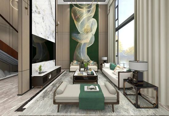 挑高的客厅让空间更宽敞,利用墙体的位置,定制打造了一整面墙品装饰画,营造一种和谐大雅的氛围。