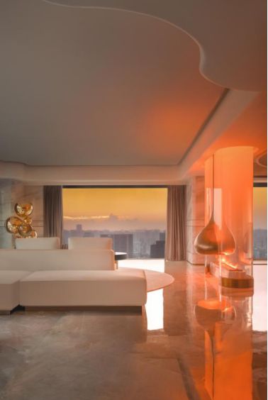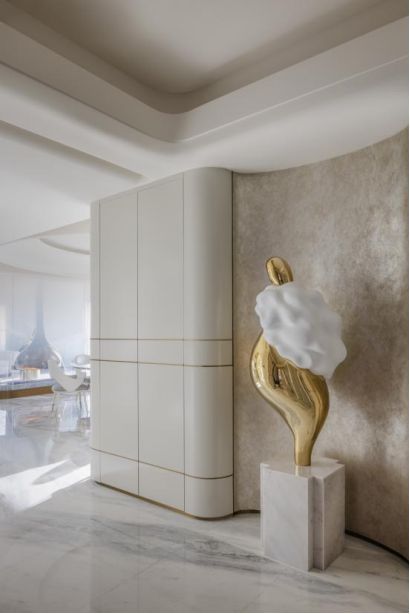 设计以窗外的云层作为概念起点,摘云入室。玄关及客厅处的艺术品、公共空间的天花曲线、落地窗边的座椅等等皆呼应云朵的形状;壁炉以半透明白色渐变玻璃来描摹厚重的云层,开启之时,火焰晕染,仿若朝霞浸染室内。“大平层产品不同于别墅或低层的花园住宅,身居高处,自然的尺度没变,风景便只能远观而无法亲近。人与、室内、与建筑、与自然,如何产生关联?这是一个挺大的挑战。为了接近自然,我动用想象,构筑一个抽象的、超现实的空间。这种思维方式如同孩子,他们相信人可以躺在云端,相信梦幻可以和现实不分彼此……于是我用‘童趣’点题。世界上没大人,只有长皱的小孩……如我、如你。”邱德光说。