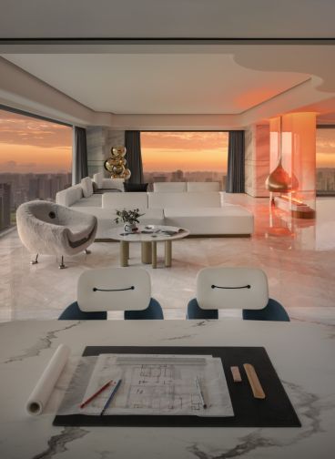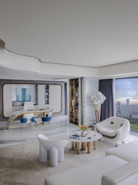 “当人们的物质需求得到基本满足时,精神需求便会显现。而室内设计需要契合时代语境下使用者的精神需求。”邱德光以“大平层”和“下一刻”为主题,对项目概念进行表述。“身居高处、浮云遮眼,下一刻即将会发生什么?我和使用者都期待着‘下一刻’,我希望将这种期待表达到设计之中。”
