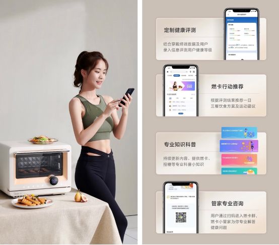 除了数据层面的提升,美的mini微蒸烤还配备了全新特研的轻火程序——杂环胺减控烹饪曲线,能够有效抑制肉类烘烤过程杂环胺的产生,减少上火和溃疡的情况产生。为了更好守护消费者的饮食健康,美的智能燃卡®mini微蒸烤料理炉PG2010W可以结合用户数据定制健康测评,根据测评结果推荐一日三餐饮食方案和运动建议,美的美居App中持续更新的科普专栏不定期提供燃卡、控糖等专业知识,搭配更专业的燃卡管家解答,四大健康服务模块量身搭建健康闭环。燃卡技术、轻火曲线和云端健康服务让美的mini微蒸烤成为更懂中国家庭健康饮食需求的烹饪产品。