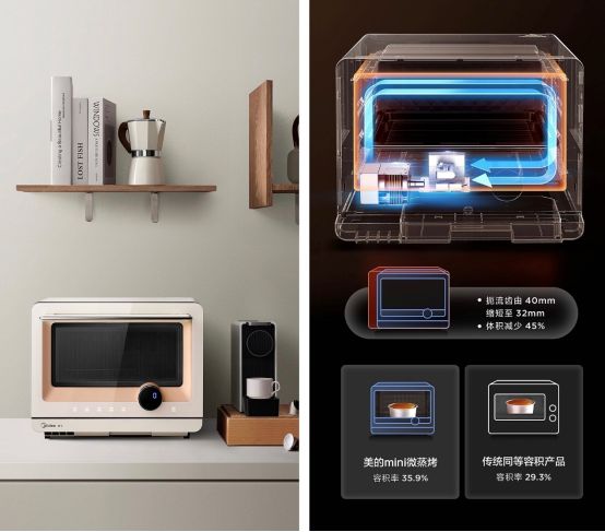 居住环境小型化的趋势下,家居空间的合理适配成为重要考虑因素之一。如今的厨房收纳愈发普及,厨电配置正朝着小而精的新趋势转变,轻量化智造也已成为未来厨电发展的新方向。美的智能燃卡®mini微蒸烤料理炉PG2010W的开发深度结合小厨房家庭的需求和厨房电器的发展趋势,在保证20L常规家庭容量的前提下,革命性地将磁控管体积缩小了45%,搭配全下拉门和超薄内壁设计,将产品内部空间利用得恰当好处。一系列关键结构部件的优化让美的mini微蒸烤的外形更为灵活小巧,对比同容量、同级别产品,美的做到了35.9%的极致容积率,其占地面积比四张A4纸还要小。其顶部、侧面无散热孔的设计也让产品摆放更无拘束,橱柜角落随心安放,极大提升了厨房台面利用率,轻松hold住紧凑空间。