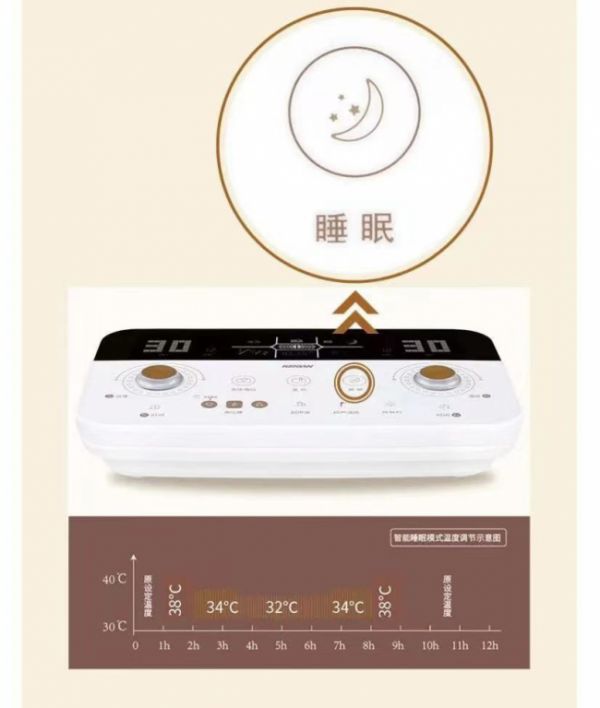 智能睡眠系统不仅能根据自身需求设定温度,还具有8小时和10小时智能睡眠模式,当睡眠模式启动后,会进行6次智能调温,12个小时后自动断电,带给您一整晚安心舒适的睡眠体验。