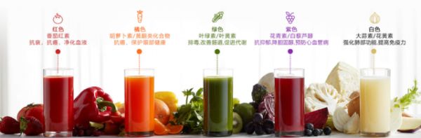 水果蔬菜中除红、橘、绿、紫、白五色植物营养素外,更含有丰富的营养物质,各种酵素、维生素、植物化学素、矿物质和膳食纤维。在日常搭配中,可根据季节、个人口味和体质的不同,进行搭配。对于牙齿不好的老人、放疗病人、小孩、做了胃肠道手术的患者、有严重妊娠反应的孕妇等人群,易消化果蔬汁可帮助他们促进蔬菜水果营养成分的摄入,帮助提高自身抵抗力。