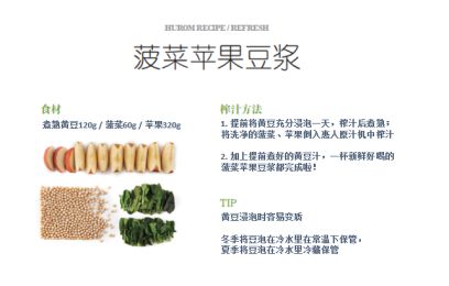 黄豆健脾利湿、润燥消水、解毒,菠菜能够平肝润燥,苹果不但益心气、健脾、还能生津止渴,更具有润肺悦心、生津开胃等功能,这款果蔬汁非常适合在秋天饮用,喜欢的朋友可以自己动手尝试下哦!(更多食谱可登录惠人官网查询)