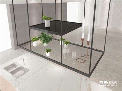 隐藏式吸油烟机集是智能化与精致化于一体,是紧跟潮流的点睛之笔。触摸滑控式按键操作便捷,多层金属滤网有效减少厨房油烟,自带LED节能照明灯提供烹饪照明,全黑质感的外观更是将操作台升级为时髦地带。电动岛台的环绕嵌入式灯带构筑虚实层叠;铝框玻璃门高柜自带氛围灯和照明灯,灯光流转熠熠生辉。吊顶金属支架营造时尚现代的空间,透明和黑色亚克力隔板上下错落有致,增强通透感与装饰性,设计美学与生活情调肆意绽放。