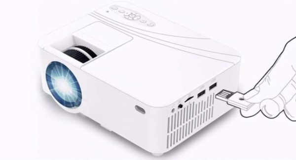从外观来看这款投影仪和其他近百元投影仪的设计很接近,拥有纯白外观,投影仪上部实际了手动的调焦滚条和手动操作面板,在外部接口上,瑞视达T1拥有两个usb接口和一个插TF卡的卡槽。总体而言,瑞视达T1整体整洁大方,大小适中,讨人欢喜。
