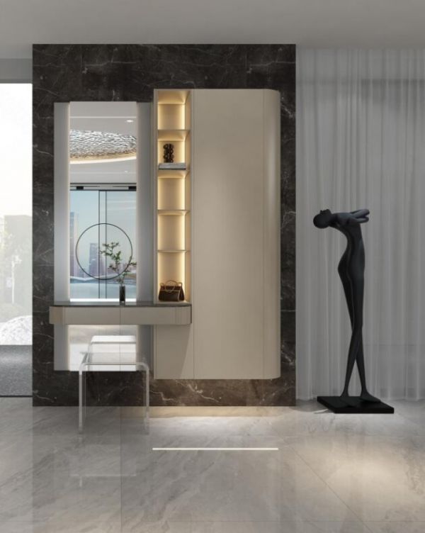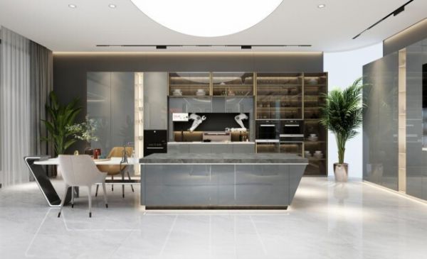 星空灰抑菌岩板与皮革搭配迸发碰撞之美
