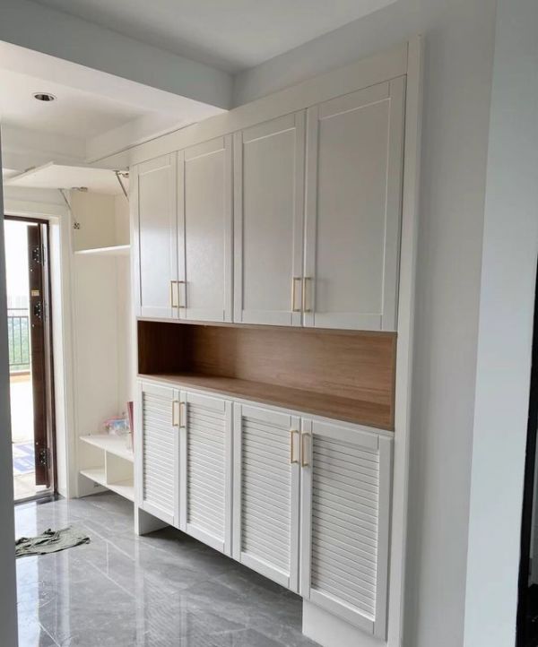鞋柜是定制的内嵌式,敲掉了厨房的隔墙,和墙面无缝衔接在一起,不仅节省空间,看起来也很美观整洁,乳白色柜门搭配金色拉手,显得大方又精致,整个鞋柜兼具了储物、换鞋凳、挂衣区、展示区的功能,底部留了空位,用来放常用拖鞋,免得每次都要打开柜门找,很麻烦的,还有下半部分的柜子是做的百叶门,便于鞋子通风透气,避免太闷产生异味。