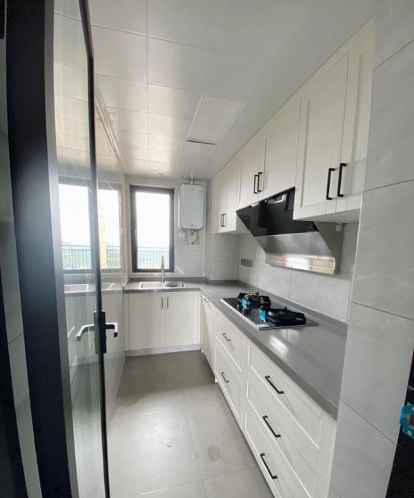 走进厨房,满满就看到了家的样子,燃气灶和油烟机都安排上了,仿佛见到了屋主拿着锅铲开心烹饪的场景。地面铺了仿古砖,这种材质的砖具有防滑耐磨的效果,用在厨房是最适合不过了,L型的橱柜布局,操作灵活,储物也充足,合理利用了空间,白色橱柜搭配黑色拉手,加上灰色的石英石台面,打造出时尚又大方的厨房环境。