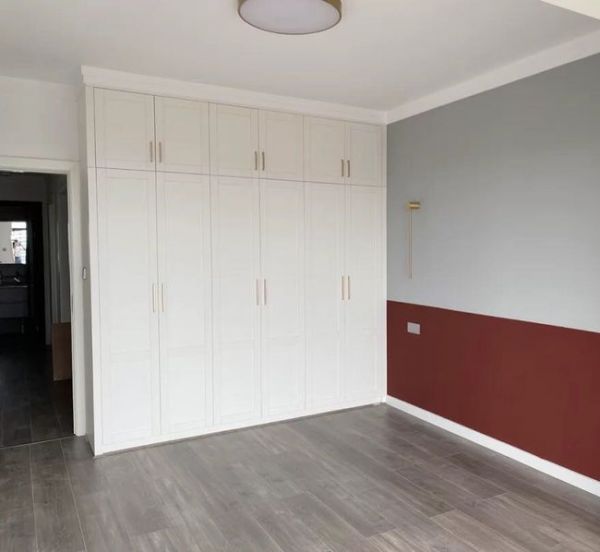 主卧铺的木地板,给睡眠环境增加一些温馨的感觉,顶部走了一圈石膏板造型,现在很多家庭的卧室几乎都是这样设计的,比厚重的吊顶显得敞亮多了,不会产生压抑感,加上一盏吸顶灯,一下就拉伸了视觉层高。床头背景墙采用灰色和复古红撞色拼接,形成强烈的视觉反差,显得时尚有趣,就算不做造型也很漂亮,衣柜和鞋柜酒柜是同样的款式,让整体风格保持一致。