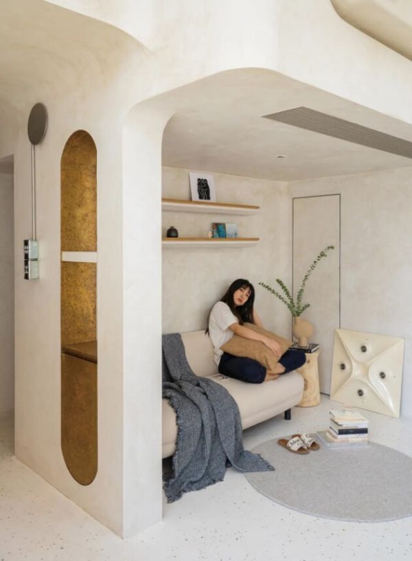 冰冰对当代艺术非常感兴趣,希望自己的家能够自然地流露出艺术气息。如果摆放装置艺术品,会让这个空间显得更加拥挤。于是,设计师选择在硬装中“做雕塑”。曲线、转角、圆筒、锥体……墙体、隔板和台面上出现各种几何造型,就像一件件雕塑作品。设计师用石膏塑形,外部再涂上和墙面一样的手刷漆,让这些雕塑体块完全融于整个空间里。
