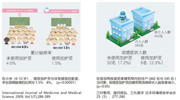 曾有专业机构在日本小学与高密度住宅进行实例验证,发现在流感期间,使用加护灵的学校和高密度住宅楼的流感率均大幅降低!