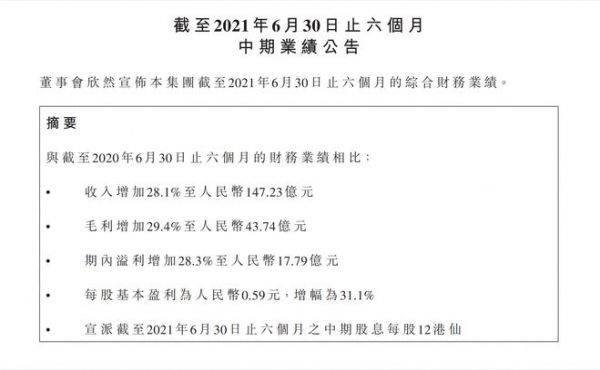 网易家居讯:8月28日,中国联塑(02128)发布2021年中期业绩。报告显示:2021年上半年,中国联塑实现营业总收入147.23亿元,较上年同期增长28.10%;实现毛利43.74亿元,较上年同期增长29.40%;基本每股收益为0.59元。