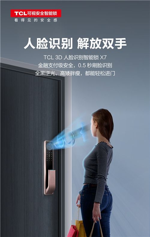 以本次发布的TCL 3D人脸识别智能锁X7为例,这款产品就搭载了最先进的3D人脸识别技术。