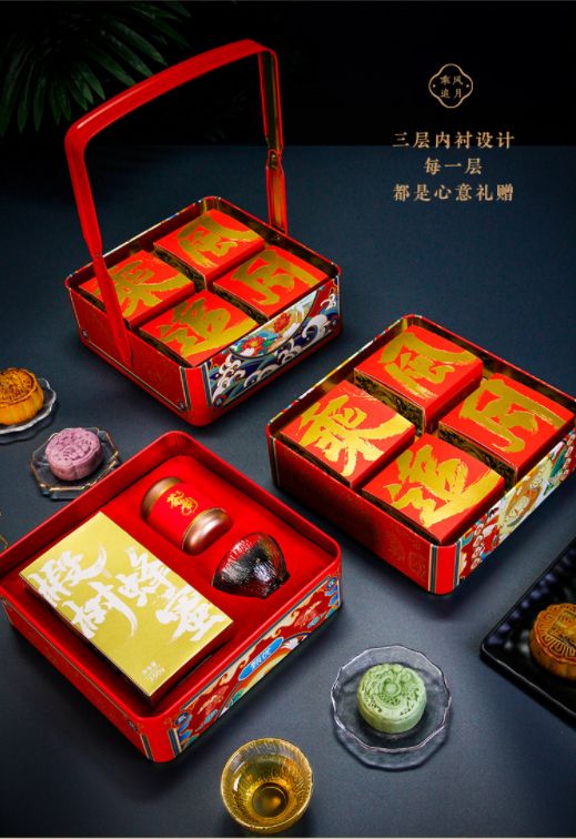“中秋佳节,乘风追月”。甄优的这款月饼礼盒以中国红为主色调,结合国潮时尚元素设计了新中式三层礼盒,颇有古代食盒的审美意趣。礼盒包装上潇洒的书法字体体现出大气磅礴的国风质感。