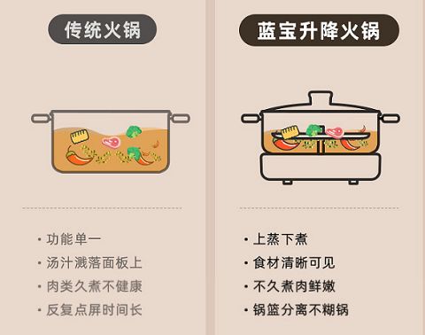 升降式的设计不仅让火锅的扩展性非常高,也提升了用户体验。传统火锅不可避免地要面对食材难以捞起、溅油、易吃到花椒底料、多人同吃、漏勺不够用等诸多“饮食痛点”,而蓝宝升降火锅站在用户的角度去设计产品,从技术上进行创新,一举解决传统火锅所存在的弊端,大幅度提高吃火锅的体验。