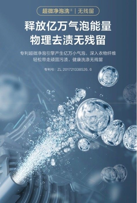 在产品核心技术方面,小天鹅洗衣机搭载有小天鹅自研的超微净泡洗技术。在该机的内筒中,拥有超微净泡引擎。洗衣开始后,超微净泡引擎可以产生亿万级纳米小气泡,这些气泡会深入衣物纤维并通过高频震动带离污渍,同时,这些气泡爆炸产生的巨大能量也能够将污渍从衣物纤维中更强劲地剥离出来。彻底清除熊孩子在外玩耍时沾染的各种污渍,同时,物理去污方式还能减少洗衣液等化学洗涤剂的使用,避免化学洗涤剂在衣物中残留的问题,呵护孩子的健康。