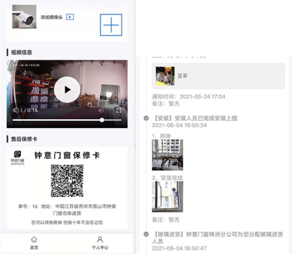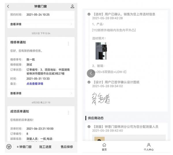 如上图:通过微信公众H5实现了在微信上自动安排工作,测量、生产、送货、安装、售后维护等等,信息一体化管理,高效精准的保障客户的体验和服务,全程顾客进度可视化,为钟意门窗核心价值观,诚信提供了有效的支持和保证。