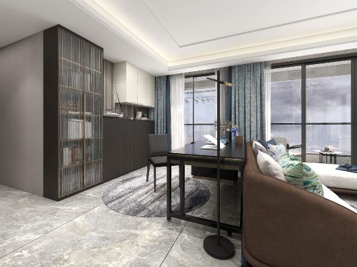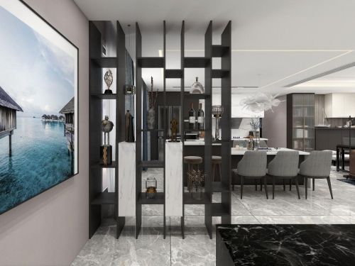 对比原狭窄的书房空间,开放式书房视线更开阔、心情更明朗,办公休闲的效率也会更高。书架设计可以摆放书籍或奖章,提升整个客餐厅格调的同时也是实用派。