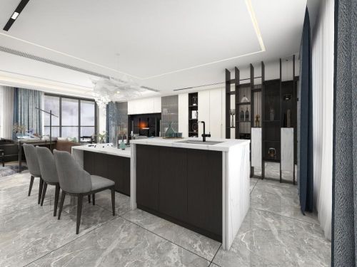 开放式厨房与餐厅兼用,瞬间增加了视觉上的空间感。没有多余的隔断,让厨房这个本来就充满烟火气息的地方,变得更加温情;更利于交流,可以边煮饭边和家人聊天,家庭聚餐时操作台可变身为餐桌使用,同时可容纳14人就餐。餐桌及操作台下设置收纳柜,满足餐边柜的收纳功能,使整个空间更大气整洁。