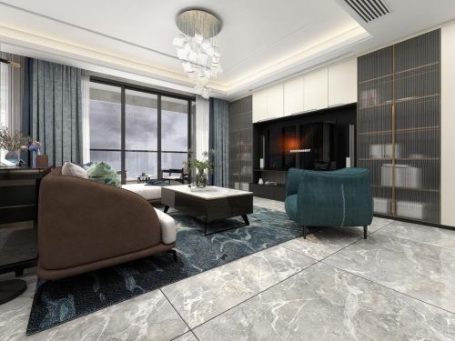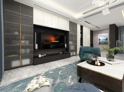 电视墙的位置由原方案改为进门右手边的墙面,满墙的造型设计对比原方案更高大上,超大的电视背景可设置家庭影院效果投影屏,电视墙的右边设置玄关柜收纳功能,一个多功能柜解决客厅与玄关的所有物品收纳。
