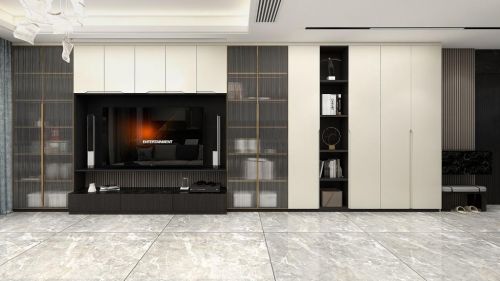 通透装饰收纳层架设计打破原有沉闷的柜体,提升空间档次,半开放的视觉效果让空间更显神密感,主人可将喜欢的饰品摆放在层架,打造居家氛围感。