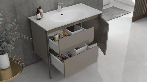 产品具备半盖镜箱收纳,美妆收纳;台面收纳,临时摆放;柜体组合收纳,长期储备;针对浴室的日常收纳功能,浴室柜进行了合理的分区设计,可充分满足您和家人日常所需。