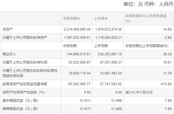 公告显示,报告期内南京我乐家居股份有限公司实现营业总收入7.45亿元,同比增长38.38%元;实现归母净利润5252.28万元,同比增长10.91%;每股收益为0.16元,同比增长7.69%。