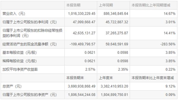 公告显示,报告期内湖南梦洁家纺股份有限公司实现营业收入10.16亿元,同比增长14.67%;归属于上市公司股东的净利润4709.97万元,同比增长3.01%;归属于上市公司股东的扣除非经常性损益的净利润 4263.51万元,同比增长14.41%。