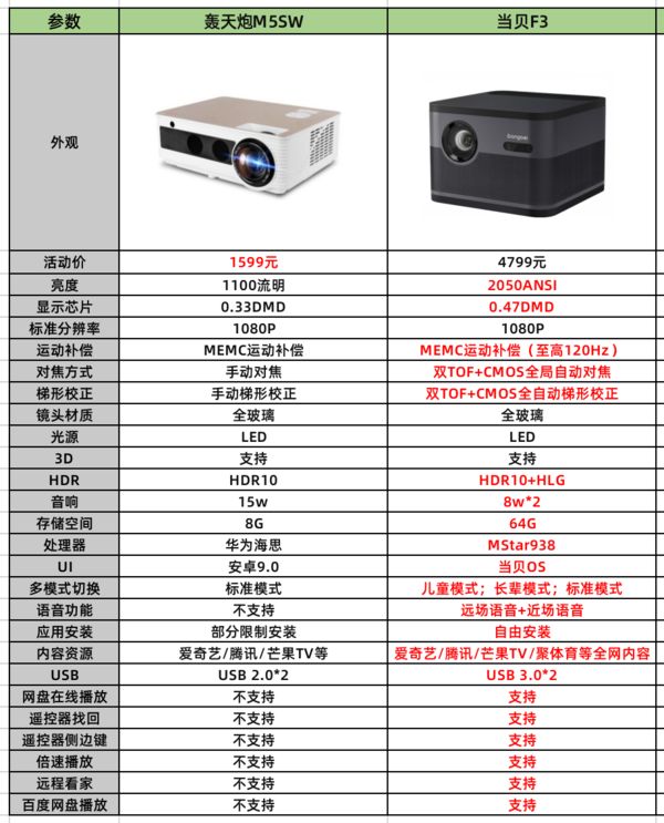 从画面亮度来说,当贝F3的亮度要高于轰天炮M5SW。轰天炮M5SW是采用LCD技术的投影仪,与其他千元投影仪不同,轰天炮M5SW搭载了0.33英寸的DMD显示芯片,支持1080P视频播放,而因是LCD技术,在投影仪使用的后期,亮度会打折扣。当贝F3采用的是DLP技术,搭载了0.47英寸的DMD显示芯片,支持真·1080P至高4K视频播放,光源寿命高达10年以上。