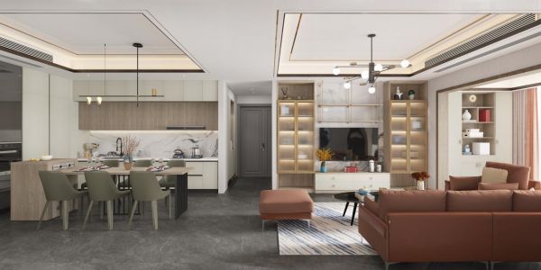 半开放式电视柜遵循中国传统美学讲究的对称排布,呈“回”字型对称,展现秩序之美。客餐厅一体化,空间更显大气通透。