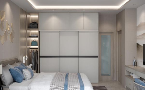 以天鹅绒灰搭配墨蓝点缀,卧室空间不沉闷,更添清幽素雅。衣柜合理设置挂衣与叠放收纳区,藏露有序。