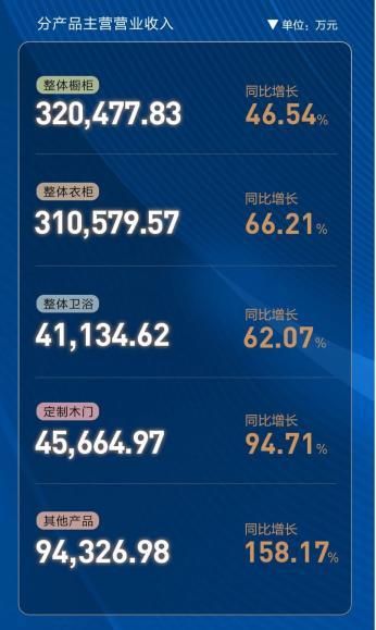首先,欧派大家居3.0时代体现在其不断成型的家居生态平台的缔造上。据报告披露各细分品类的成绩为:整体橱柜32.05亿元,同比增长46.54%;整体衣柜31.06亿元,同比增长66.21%;整体卫浴4.11亿元, 同比增长62.07%;定制木门4.57亿元,同比增长94.71%;其他产品9.43亿元,同比增长158.17%。