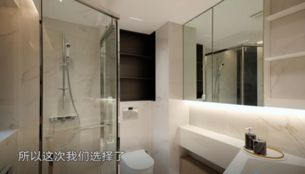 为了更好的满足老年人的生活需求,卫生间专门安装了移门式淋浴房,更方便老年人进出淋浴间。墙上的扶手和紧急按钮的设计,消除了老年人在浴室内的安全隐患。卫生间橱柜选择了两开门的镜柜,在解决生活起居问题的同时还满足收纳控的需求。