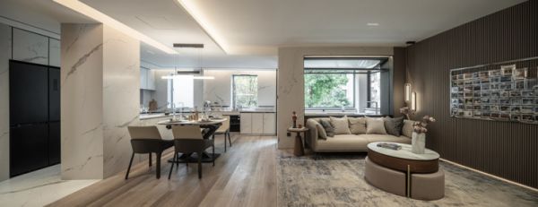 为了完成委托人的嘱托,设计师凌子达专门选择开放式的厨房设计来打开原本封闭的空间,用将近10米的操作台充分满足了两代人的生活需求。采用透明或移动式隔断,把厨房、客厅和书房的空间打通,并用倾斜的墙面替代90度的锋利转角,进一步优化南北通透的室内格局,在释放空间的同时还大大增加了居住的安全性。
