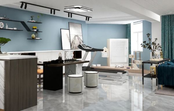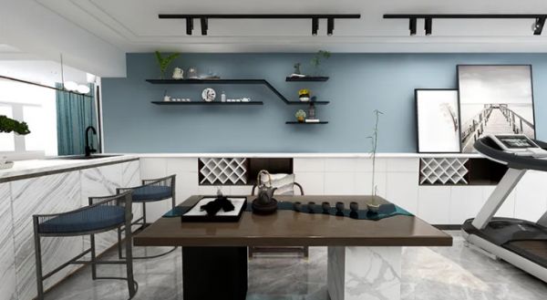 更有意思是,设计师合理利用了客厅的开阔空间,同时容纳了健身区、工作区、品茶区以及吧台等不同区域,杂而不乱,别具情调。尤其是吧台,瞬间增添了生活的闲情逸致,无疑是妥妥的加分项。