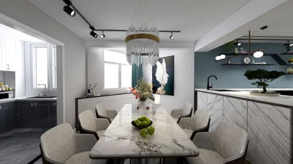 餐厅与厨房的设置也较为“通透”,自成空间,与客厅的联系则由吧台形成隔断。整体色泽上,区别于客厅的冷色系,以象牙白的优雅大气色调凸显出餐厅的别致。