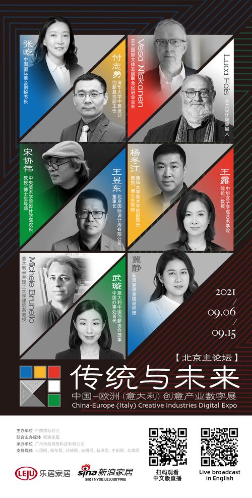 9月6日,以“传统与未来”为主题的主论坛将在新浪家居总部(北京)启动,并进行全球多点在线直播,论坛现场将邀请中国国际商会领导、意大利米兰设计周策展人、意大利知名设计师、国内知名艺术高校以及国内外创意产业人士等各领域领导专家,共同探讨中欧创意产业的合作交流,同时此次的创意产业数字展也将正式开启。