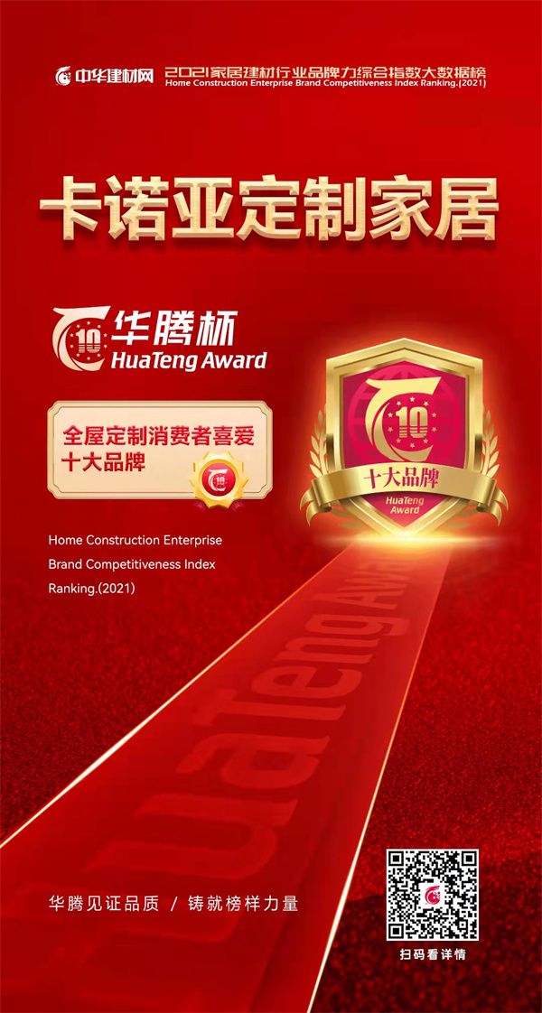 9月1日,由中华建材网主办的“华腾杯·2021家居建材行业品牌力综合指数大数据榜”重磅揭晓,卡诺亚定制家居凭借品牌综合实力,荣获“全屋定制消费者喜爱十大品牌”,彰显公司在产品、设计及服务层面满足新消费升级需求,助力中国消费者对高品质家居和幸福生活的追求。
