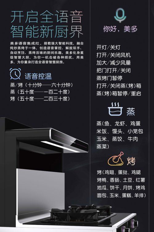 美多语音集成灶融合蒸烤炖炒一体,语音掌控,解放双手,自动烹饪,全面领跑未来智能厨房——只要一声“你好,美多!”即可唤醒,比如“打开风机”、“加大风量”、“蒸鱼”、“烤鸡翅”等语音指令,进店客户可以直观感受到语音操控集成灶的魅力,下厨动动嘴就好,非常的省心省力,哪怕普通话讲不好都不怕,美多语音集成灶连方言都听得懂,这不仅在行业里是数一数二的,也非常贴心地考虑到了消费者对功能多的产品操作不好的困扰,还可以有效避免油污手操控界面,避免下厨的时候手忙脚乱,像美多语音蒸烤一体集成灶连蒸烤门都能语音操控开关,避免老是弯腰……虏获了很多消费者的心!