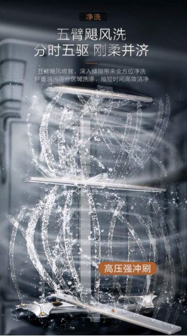 众所周知,中餐一般都是重油,而且用餐过程中碗碟多。然而,传统洗碗机在洗碗过程中,喷臂往往喷射方向单一,部分角度无法全面覆盖;同时部分餐具较脆弱,可能需要轻柔水压清洗、部分餐具重油重污需要强力清洗,用户需分类清洗,最终造成餐具重油难洗、死角清洗难度大、且厨房狭小细菌易滋生等中国厨房常见难题。