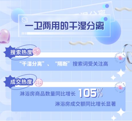 “我都快憋不住了,你却在卫生间里唱起了歌”,上班出门前争分夺秒地抢厕所,或是在内急时苦等家人结束洗澡,是很多家庭司空见惯的情形。卫生间干湿分离越来越被人们所追捧,其中很重要的一个原因就在于它能够缓解人口众多家庭早晚高峰的使用压力。相比传统卫生间,单独拎出洗漱区能将卫生间的功能互相分担、彼此独立、互不干扰,避免“抢卫生间大战”。来自京东居家的搜索数据显示,“干湿分离”、“隔断”关键词搜索热度在今年持续升高;从京东居家平台2021年1月-7月的销售数据来看,淋浴房商品数量同比大增105%,呈现大幅上涨趋势。在卫生间里安置整套淋浴房,成为备受年轻人欢迎的干湿分离捷径。