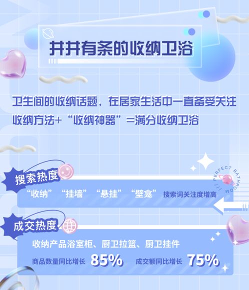 中国家庭卫浴空间普遍较小,收纳问题一直是绕不过去的难题,对于喜欢尝试各种洗护用品的年轻人来说,大大小小的瓶瓶罐罐很容易就将空间堆积得杂乱不堪,这种时候就需要各种收纳神器大显身手了。从搜索热度来看,“收纳”、“挂墙”、“悬挂”、“壁龛”普遍受到消费者的高度关注。收纳相关商品浴室柜、厨卫拉篮、厨卫挂件成交额同比增长75%,商品数量同比增长85%。